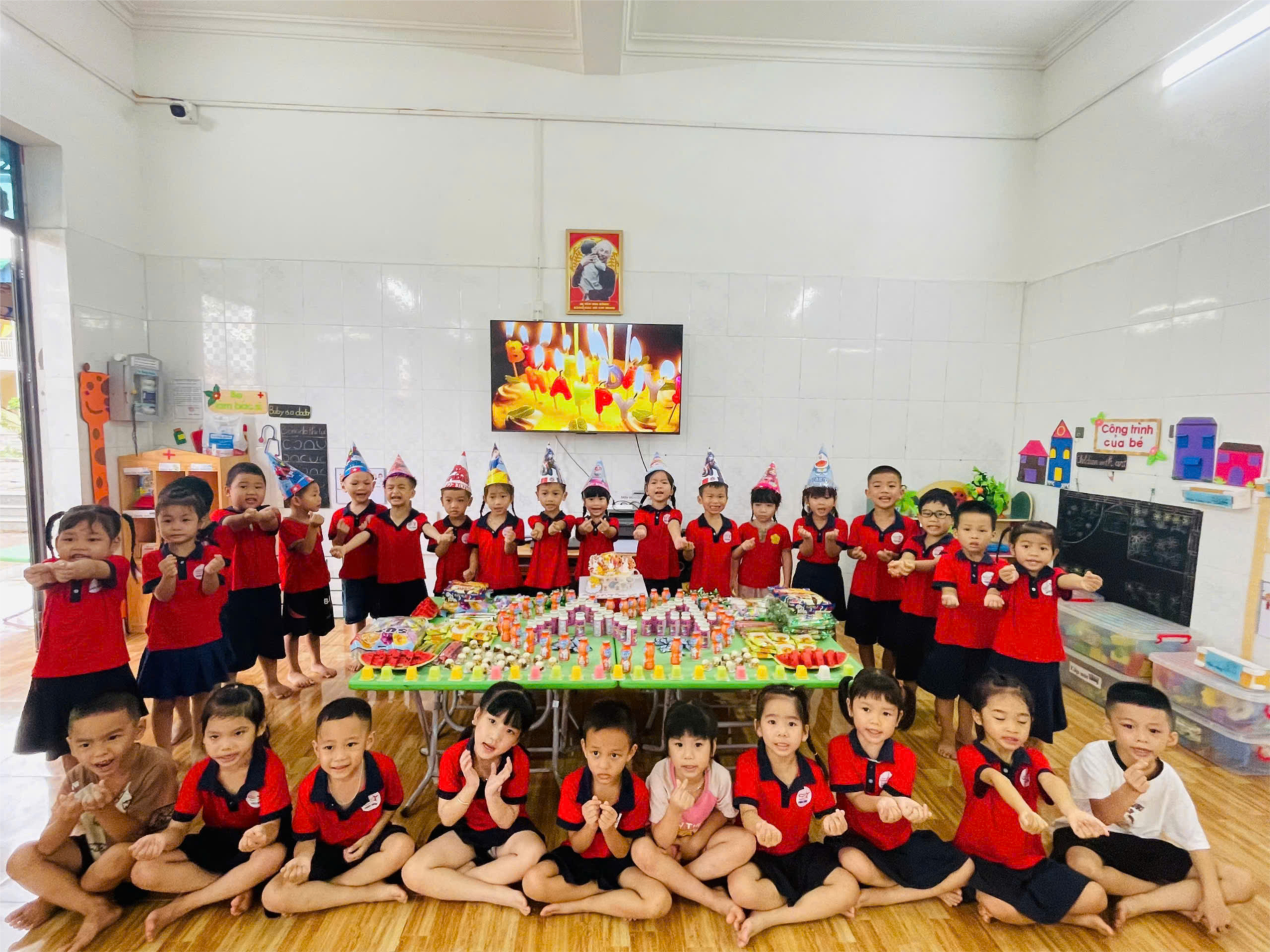 Hôm nay, lớp 5A4 tổ chức chúc mừng sinh nhật cho các con. Mỗi khi có dịp sinh nhật, các con sẽ được cùng cô và các bạn chuẩn bị bữa tiệc liên hoan: kê bàn ghế, bày bánh kẹo…Trong bữa tiệc các con còn được múa hát chúc mừng sinh nhật, làm cho bầu không khí vui tươi, cùng với những lời chúc vui vẻ và những bức ảnh kỉ niệm đáng yêu.Hôm nay, lớp 5A4 tổ chức chúc mừng sinh nhật cho các con. Mỗi khi có dịp sinh nhật, các con sẽ được cùng cô và các bạn chuẩn bị bữa tiệc liên hoan: kê bàn ghế, bày bánh kẹo…Trong bữa tiệc các con còn được múa hát chúc mừng sinh nhật, làm cho bầu không khí vui tươi, cùng với những lời chúc vui vẻ và những bức ảnh kỉ niệm đáng yêu.