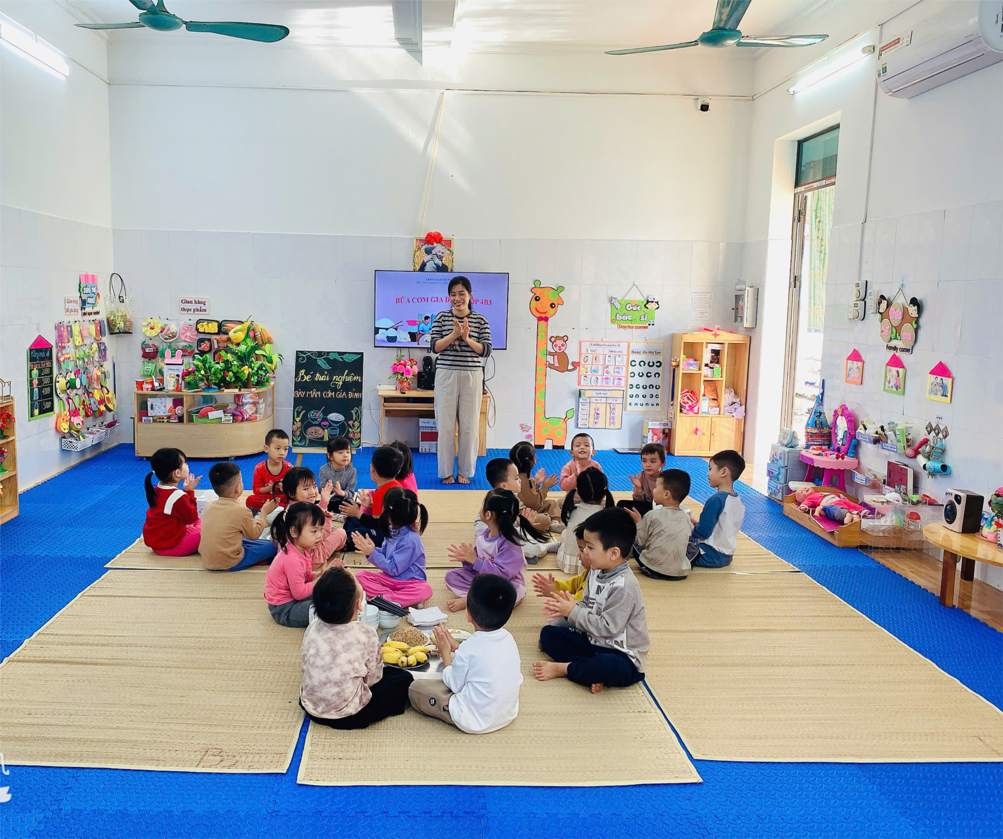 Hình ảnh bữa cơm ấm áp, nơi các bé được trải nghiệm không khí gia đình thân thương ngay tại lớp học