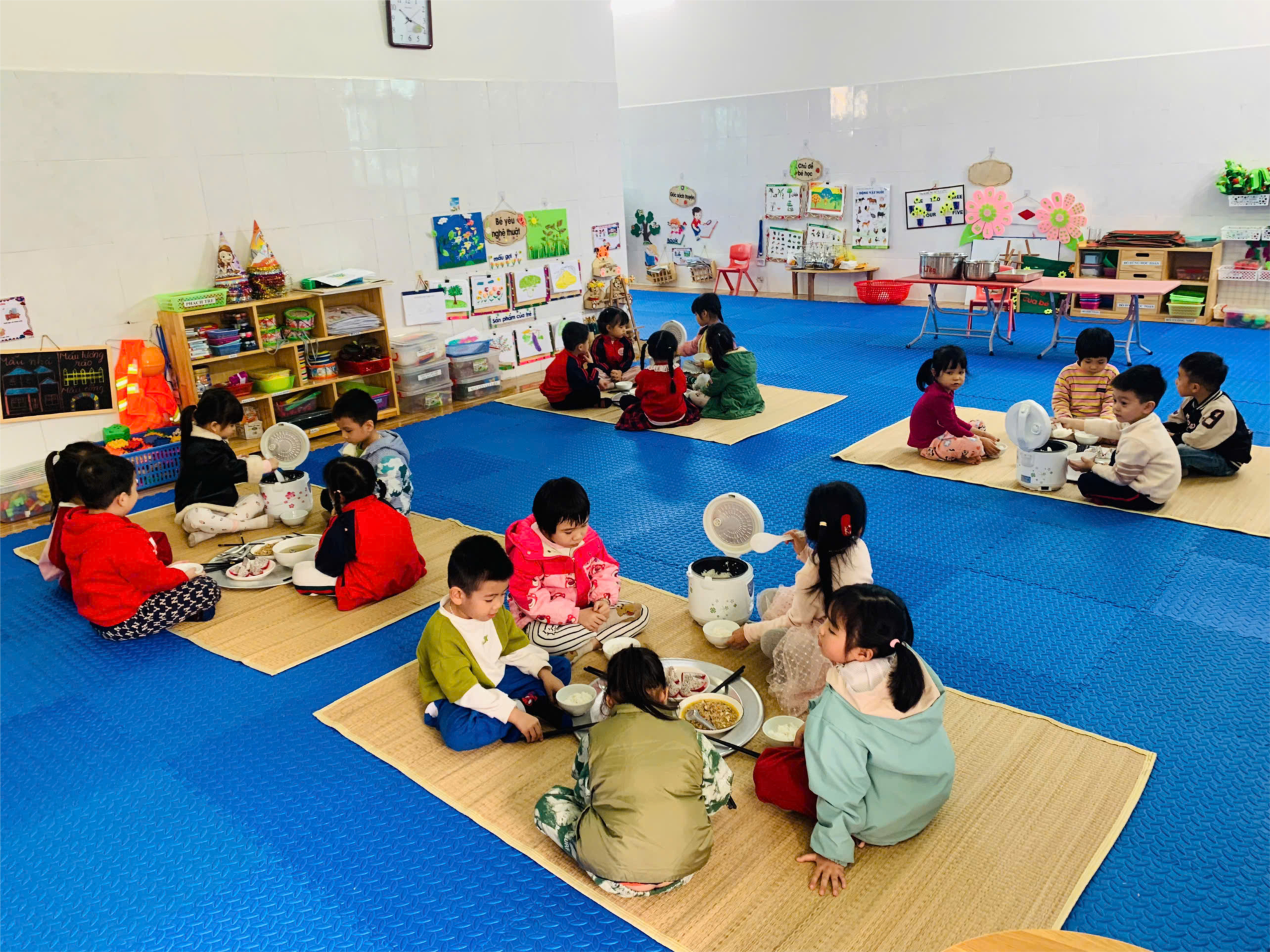Trong công tác chăm sóc, nuôi dưỡng việc tổ chức cho trẻ ăn bán trú rất quan trọng, góp phần nâng cao thể lực, phát triển tầm vóc cho trẻ. Tại trường các cô giáo đã tổ chức cho trẻ ăn bán trú thông qua các hình thức tổ chức bữa ăn truyền thống, tiệc buffet, bữa cơm gia đình. Mỗi một hình thức trẻ sẽ được trải nghiệm theo nhiều cách khác nhau, mang đến cho trẻ cảm xúc mới lạ khi dùng bữa tại nhà trường.
