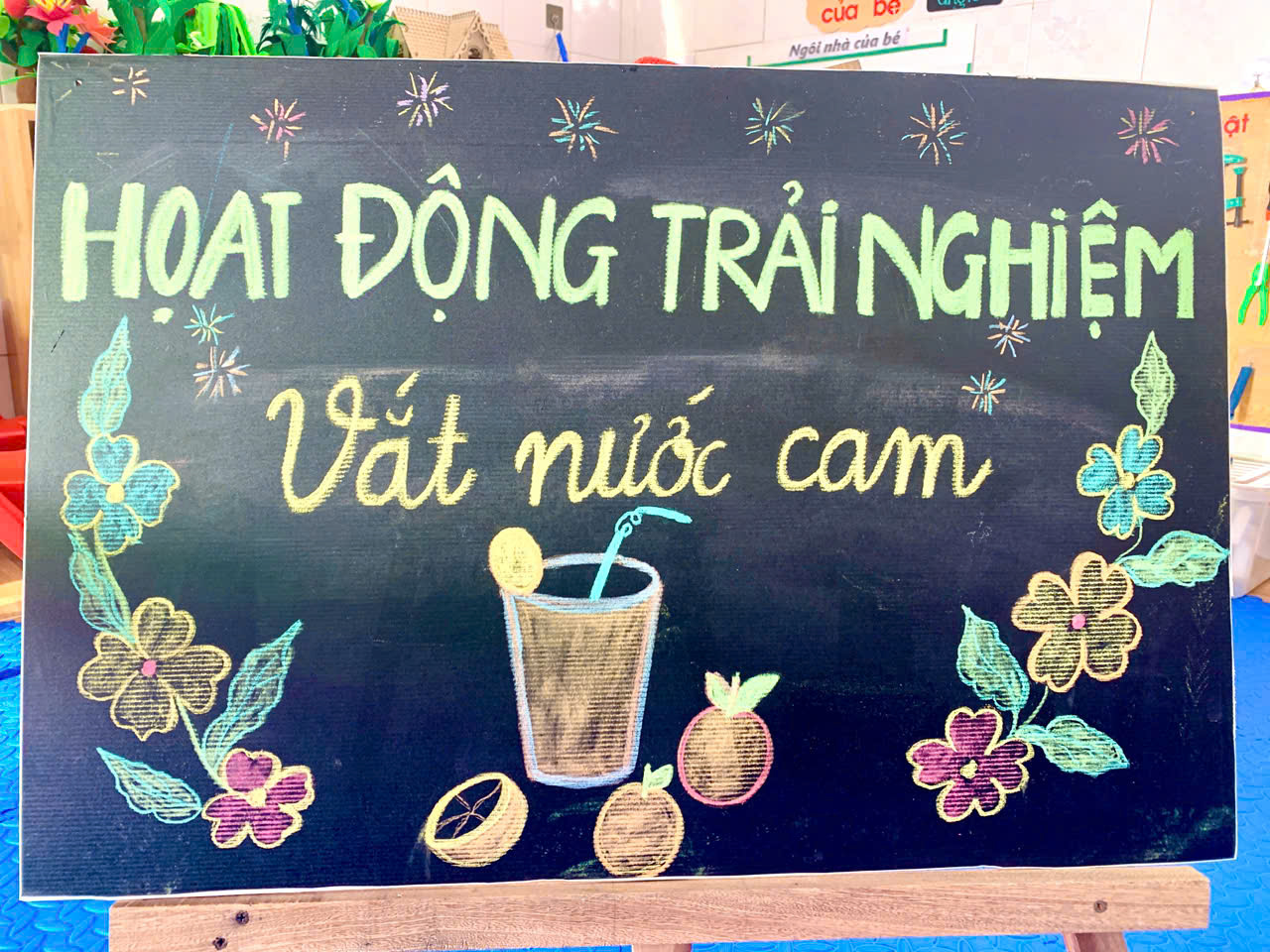 Các bé lớp 5 tuổi A2 đã có một hoạt động trải nghiệm thật thú vị với chủ đề “Vắt nước cam”. Mỗi bạn được tự tay chọn một quả cam chín mọng. Các bé rất thích thú khi dùng lực của đôi bàn tay nhỏ nhắn để xoay cam trên dụng cụ vắt và nhìn từng giọt nước cam vàng óng chảy xuống cốc. Sau khi hoàn thành, bé còn tự khuấy thêm chút đường cho vừa miệng. Ly nước cam mát lành do chính mình làm ra khiến bạn nào cũng vui vẻ, tự hào và uống rất ngon miệng. Hoạt động không chỉ giúp trẻ rèn kỹ năng khéo léo mà còn biết thêm lợi ích của việc uống nước cam tốt cho sức khỏe.