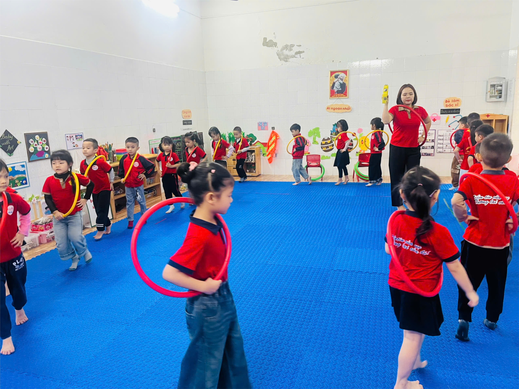 Trong buổi học, cô giáo đã chuẩn bị 7 chiếc vòng thể dục được đặt thẳng hàng, cách đều nhau trên sân trường. Các bé chăm chú lắng nghe cô hướng dẫn, quan sát cô làm mẫu, sau đó hào hứng tham gia thực hiện. Từng bước bật nhịp nhàng, chụm chân khéo léo qua từng vòng, khuôn mặt bé nào cũng ánh lên niềm vui và sự thích thú.
