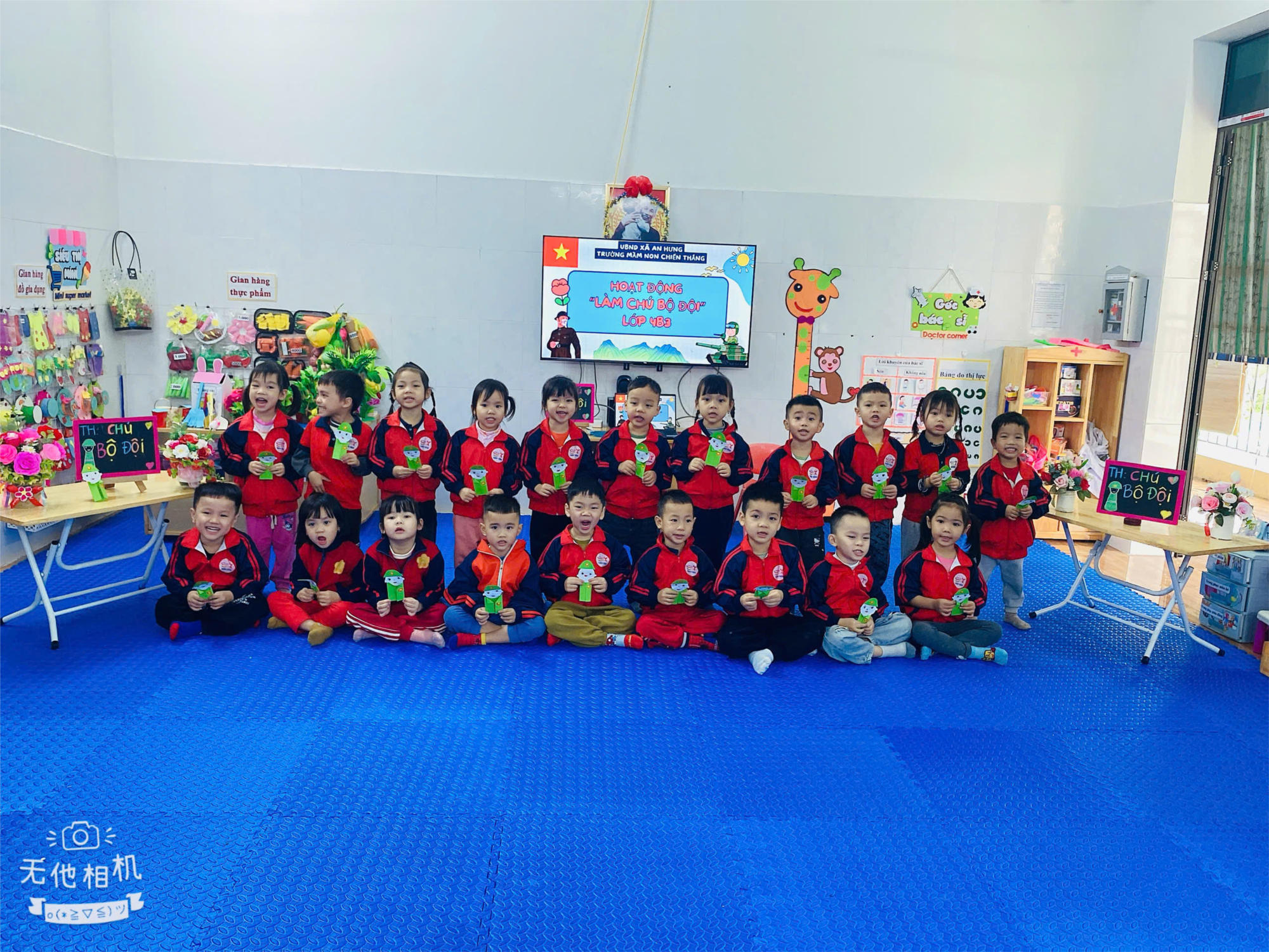 Các bé lớp 4B3 rạng rỡ chụp ảnh cùng sản phẩm “chú bộ đội” trên tay, ánh lên niềm tự hào, sự khéo léo và hứng thú sau giờ học đầy ý nghĩa.
