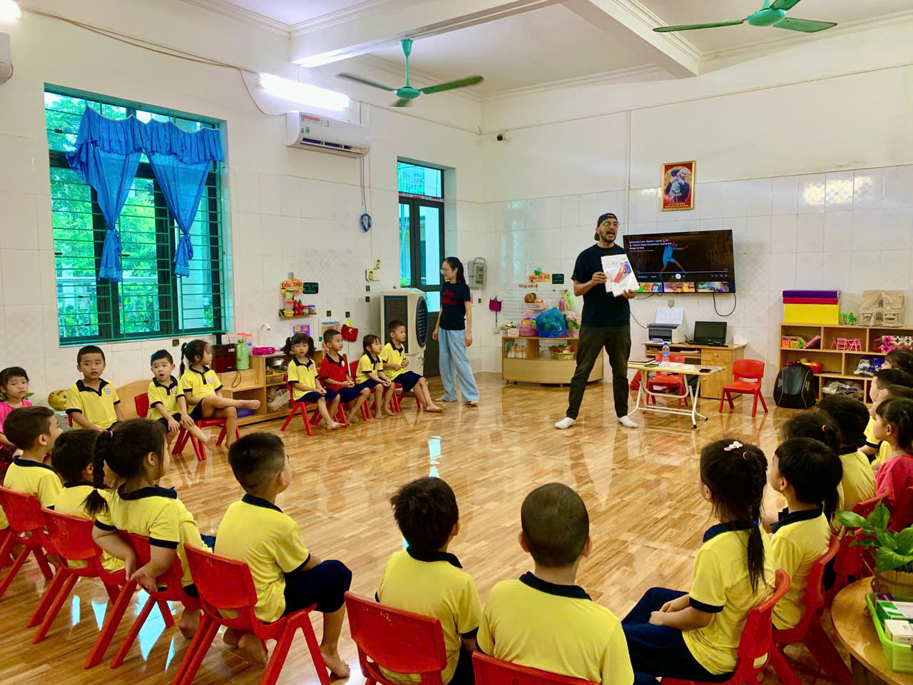 Các bé lớp 5 tuổi A2 rất hào hứng trong giờ làm quen với tiếng Anh. Dưới sự hướng dẫn của thầy, cô giáo, các bé được học những từ đơn giản về màu sắc, con vật, đồ vật quen thuộc thông qua bài hát, trò chơi và hình ảnh sinh động. Bé nào cũng chăm chú lắng nghe, mạnh dạn nói theo cô và phát âm những từ tiếng Anh đầu tiên một cách vui vẻ. Hoạt động giúp các bé thêm tự tin, hứng thú và bước đầu làm quen với một ngôn ngữ mới trong niềm vui và tiếng cười.