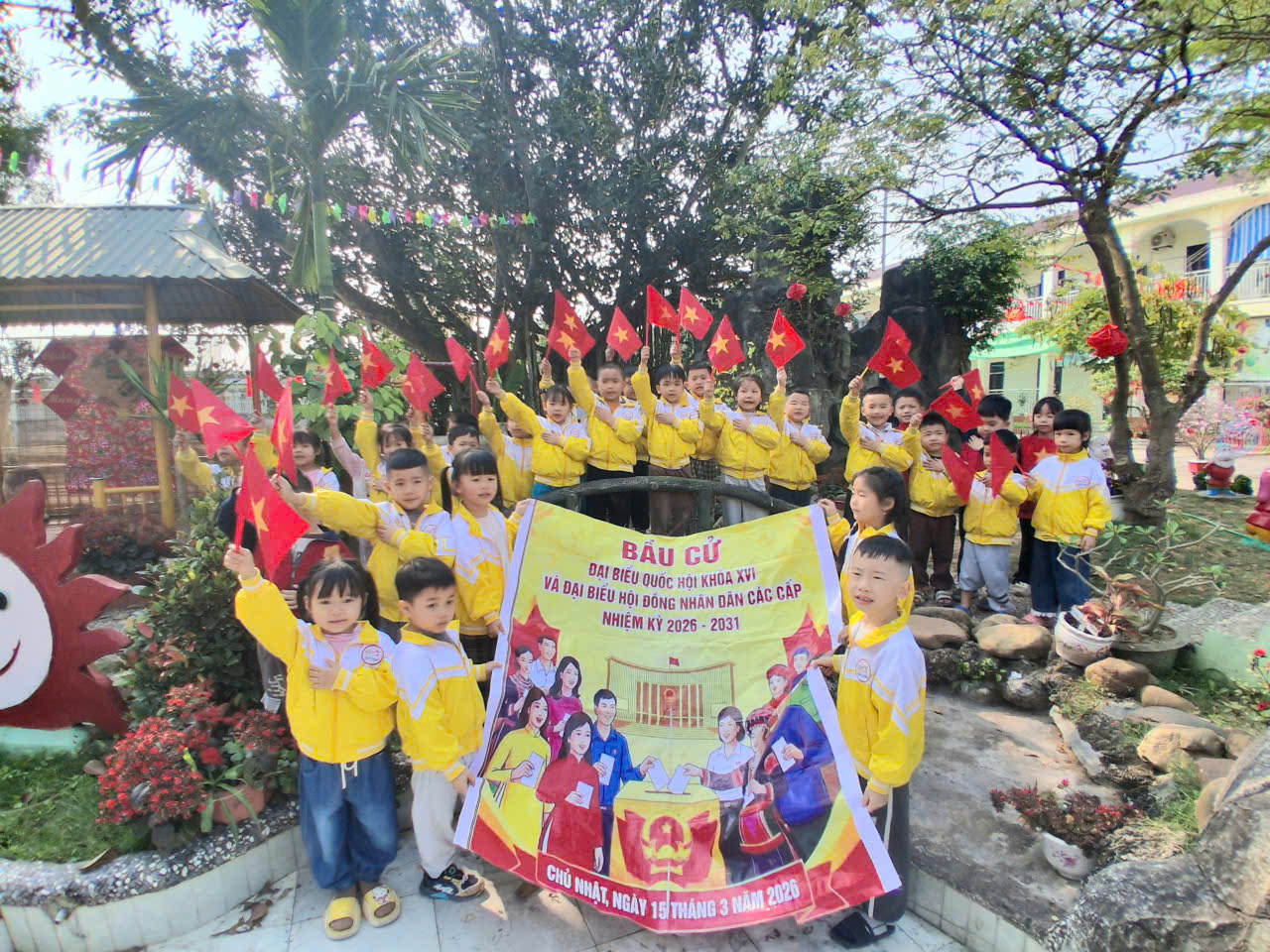 Hướng tới ngày bầu cử Đại biểu Quốc hội khóa XVI và đại biểu Hội đồng nhân dân các cấp nhiệm kỳ 2026 – 2031, các bé lớp 5A2 đã tham gia nhiều hoạt động ý nghĩa tại lớp. Thông qua các câu chuyện, hình ảnh và trò chơi đóng vai, cô giáo giúp các bé hiểu rằng bầu cử là ngày hội lớn của đất nước, khi người dân lựa chọn những người đại diện cho mình. Các bé rất hào hứng khi được tìm hiểu về lá phiếu, thùng phiếu và tham gia hoạt động “bầu cử nhí” trong lớp. Qua đó, trẻ bước đầu hình thành tình yêu quê hương, đất nước và niềm tự hào khi được sống trong một đất nước hòa bình, dân chủ.