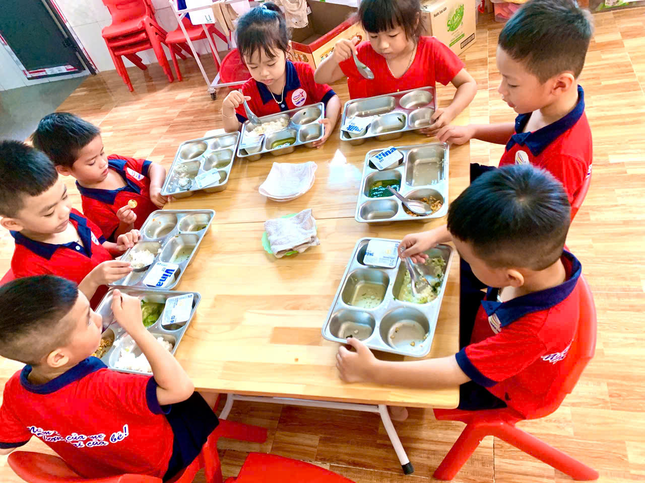 Giờ ăn khay của lớp 5A2 diễn ra thật vui vẻ và nề nếp. Khi cô giáo báo hiệu đến giờ ăn, các bé nhanh chóng rửa tay sạch sẽ, ngồi ngay ngắn vào bàn và chờ cô chia phần. Những khay cơm được bày biện gọn gàng, đầy đủ món mặn, rau và canh khiến các bé vô cùng thích thú. Bé nào cũng ăn ngon miệng, biết tự xúc ăn gọn gàng và không làm rơi vãi. Tiếng cười nói ríu rít vang lên làm cho bữa ăn thêm ấm cúng như trong một gia đình nhỏ. Sau khi ăn xong, các bé còn biết xếp khay gọn gàng và lau miệng sạch sẽ, thể hiện thói quen tự phục vụ thật đáng khen.