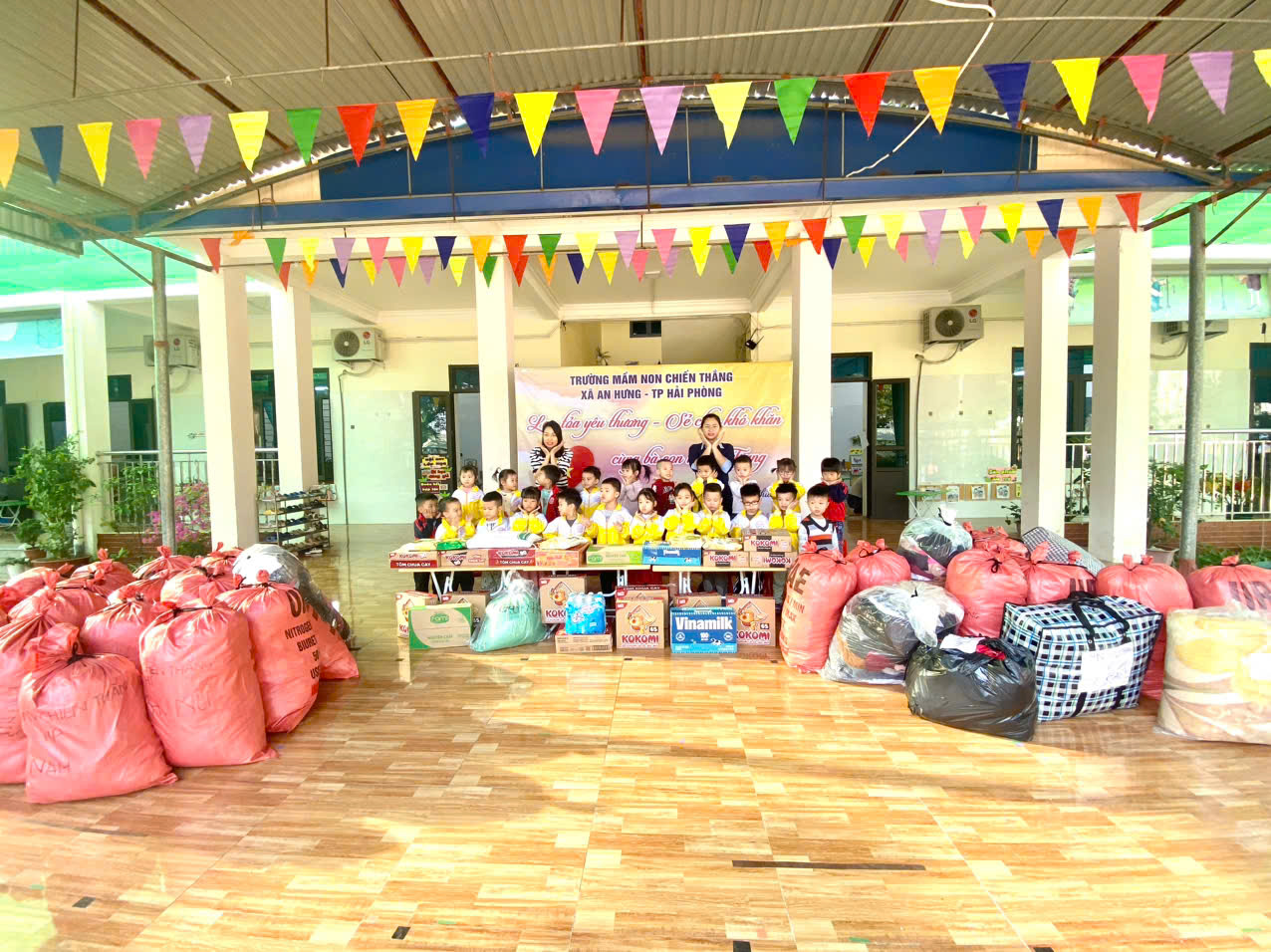 Cô và trò lớp 3C2 -Trường MN Chiến Thắng nhận quần áo, yếu phẩm ủng hộ từ phụ huynh học sinh