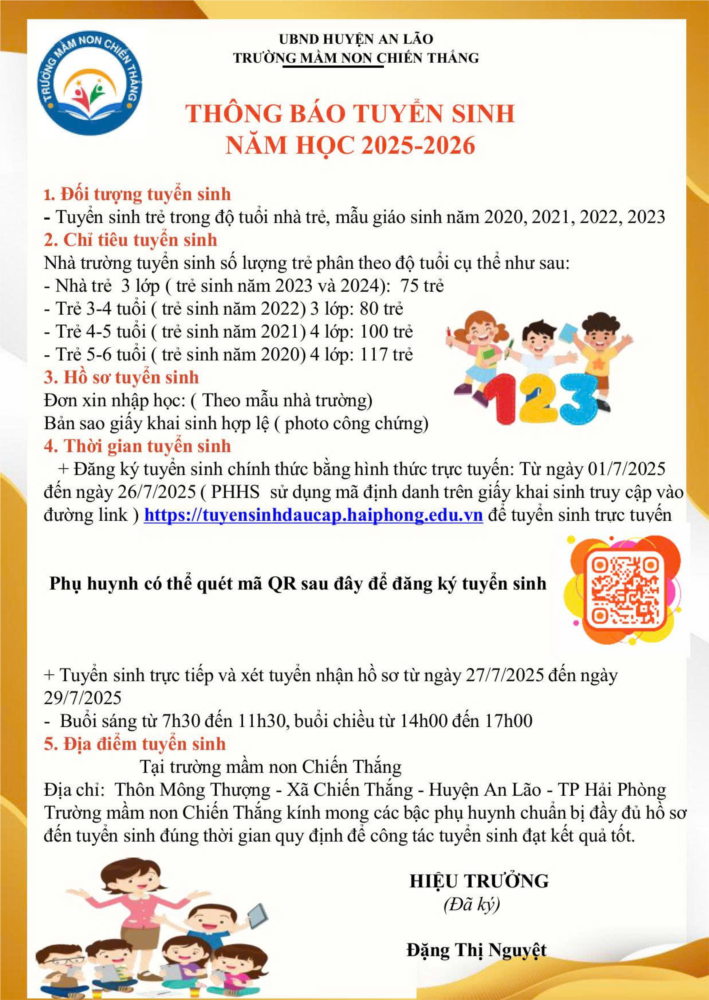Địa điểm tuyển sinh trực tiếp: Trường Mầm non Chiến Thắng - thôn Mông Thượng - xã Chiến Thắng - huyện An Lão - Thành phố Hải Phòng.