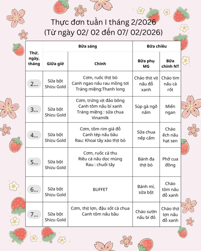 Thực đơn tuần I tháng 2/2026