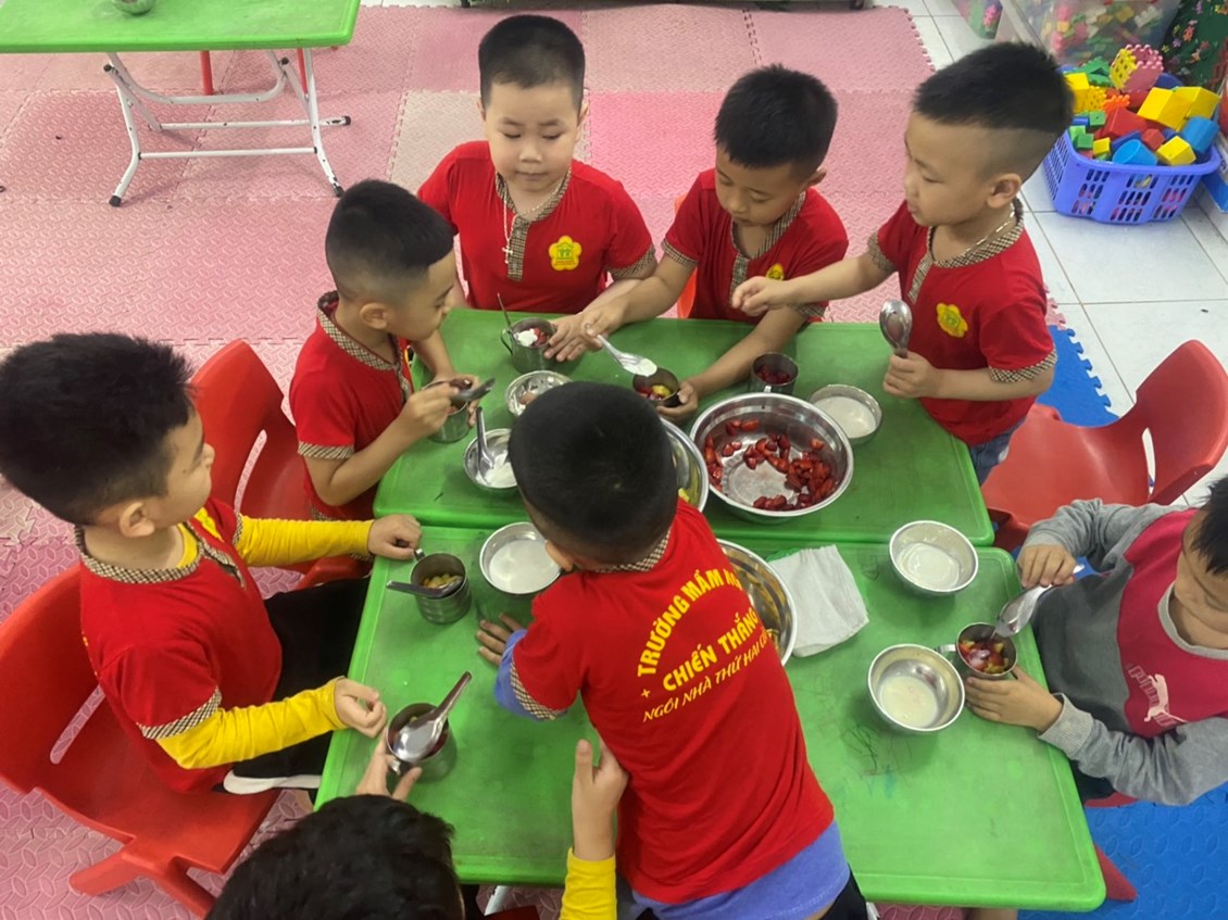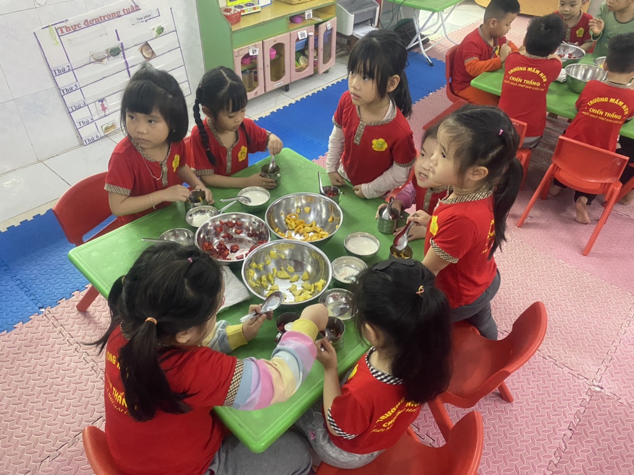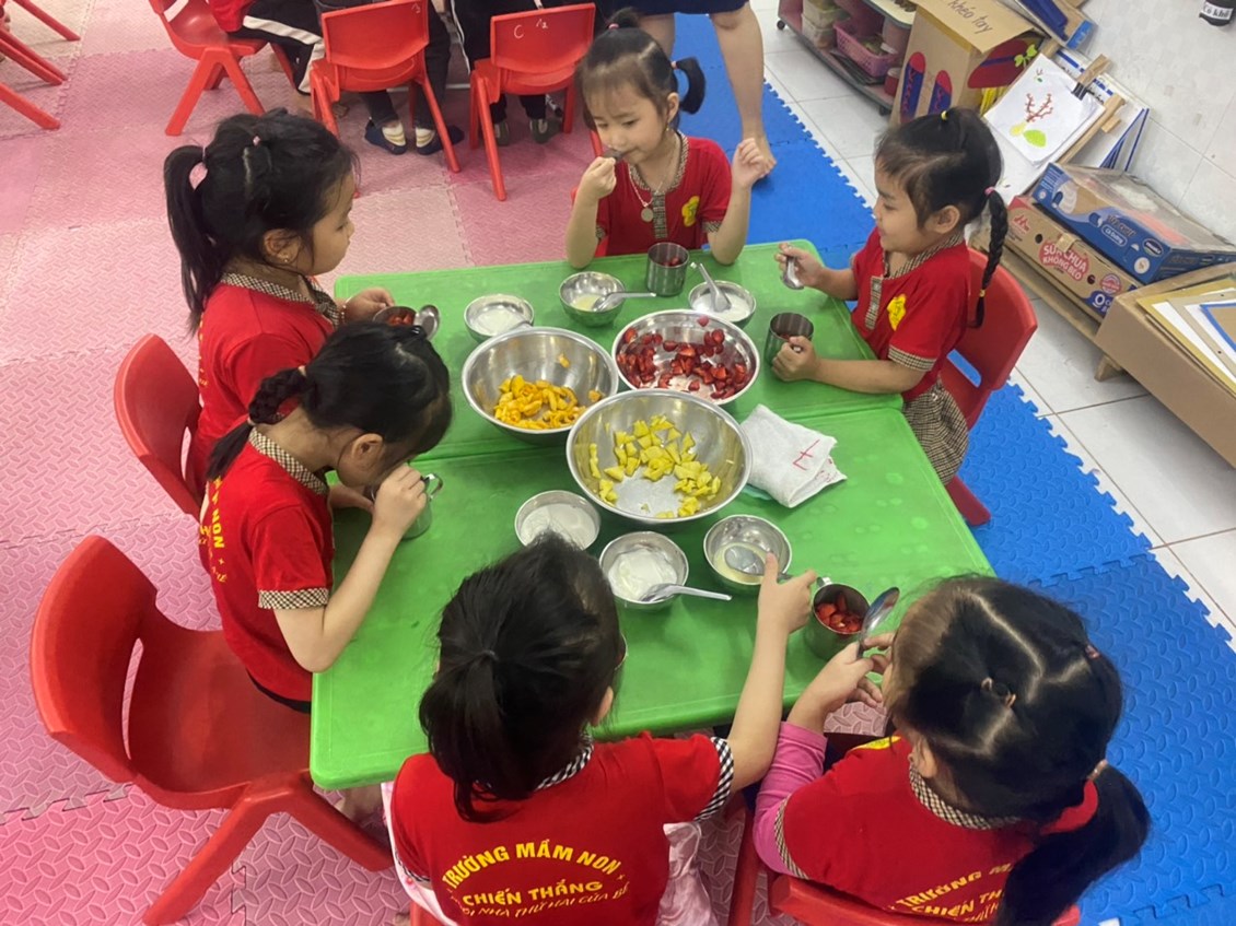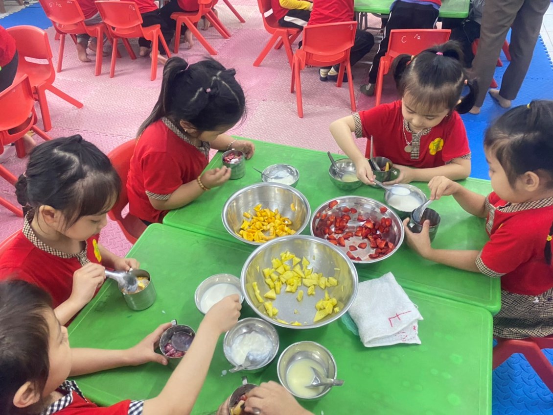 Các bạn nhỏ rất háo hứng, vui vẻ khi được tự làm món ăn cho riêng mình và cũng chắc hẳn là do chính các bạn tự tay chế biến đồ ăn của mình nên các bạn đều ăn rất là ngon miệng và thích thú. Sau đây là một số hình ảnh của hoạt động: