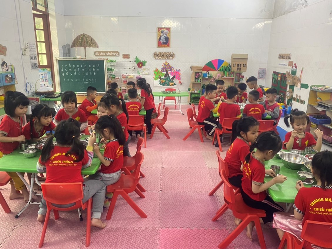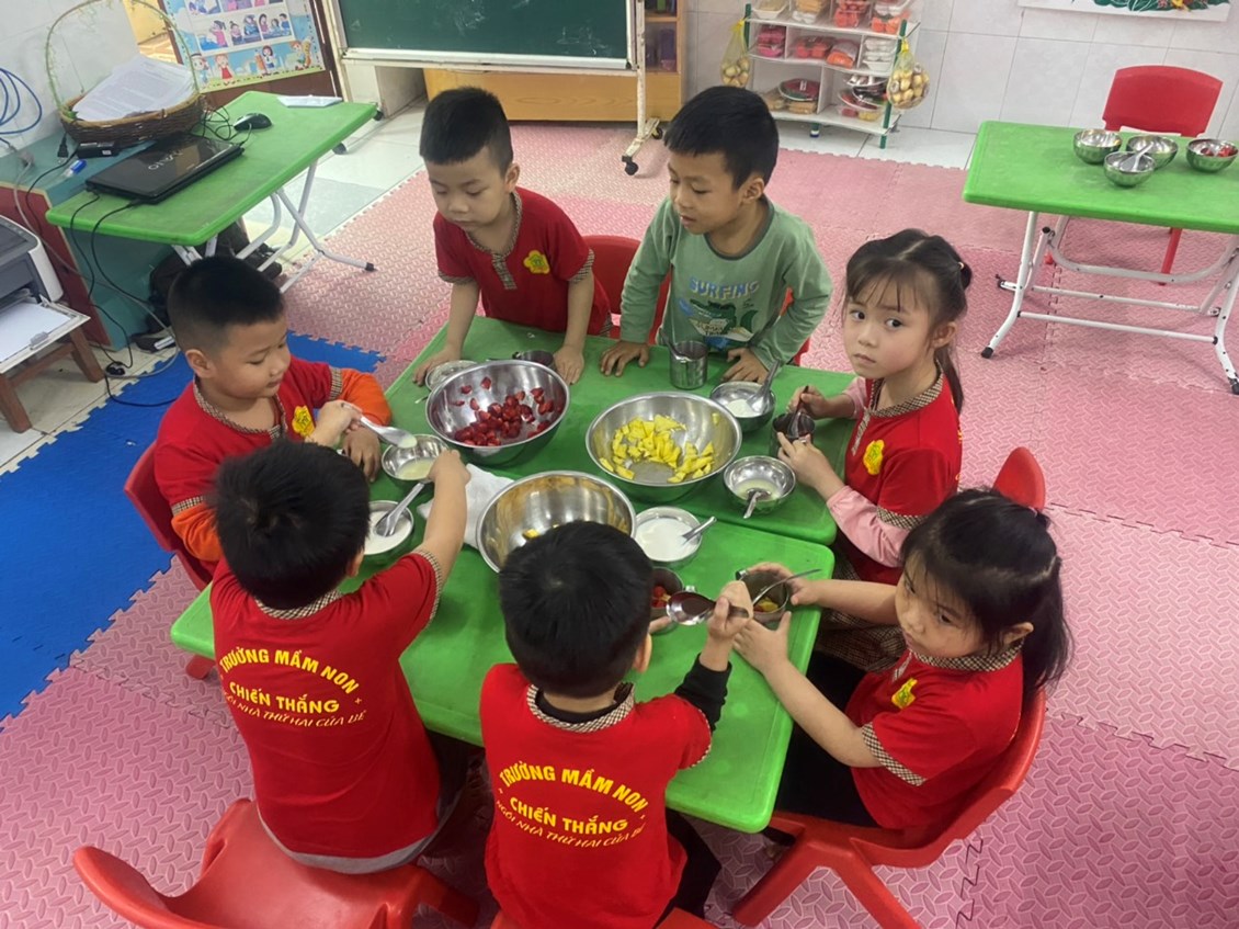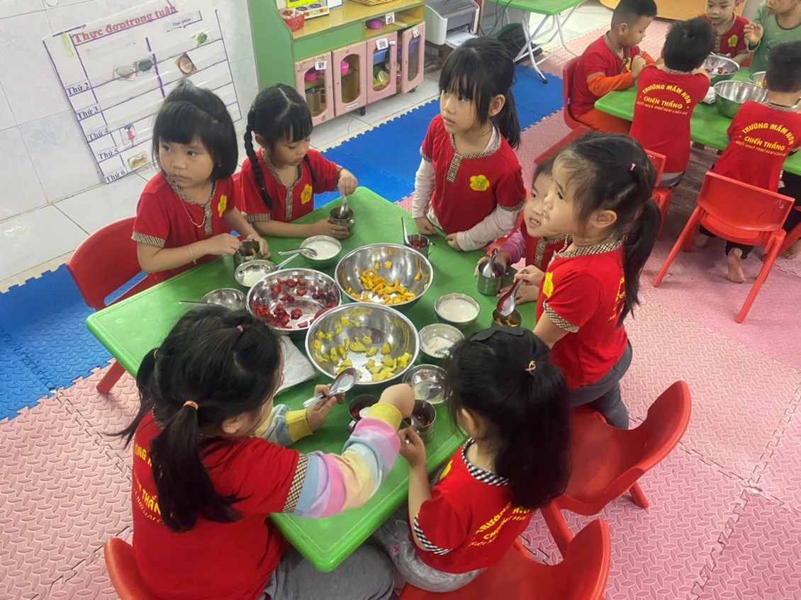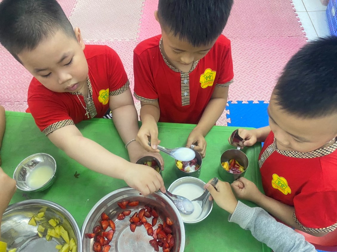 Các bạn nhỏ rất háo hứng, vui vẻ khi được tự làm món ăn cho riêng mình và cũng chắc hẳn là do chính các bạn tự tay chế biến đồ ăn của mình nên các bạn đều ăn rất là ngon miệng và thích thú. Sau đây là một số hình ảnh của hoạt động: