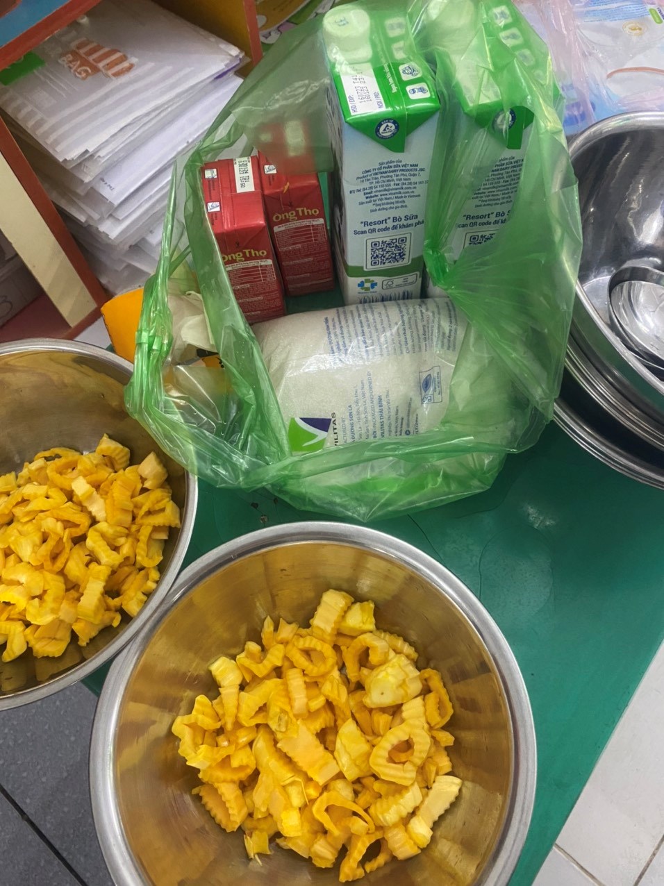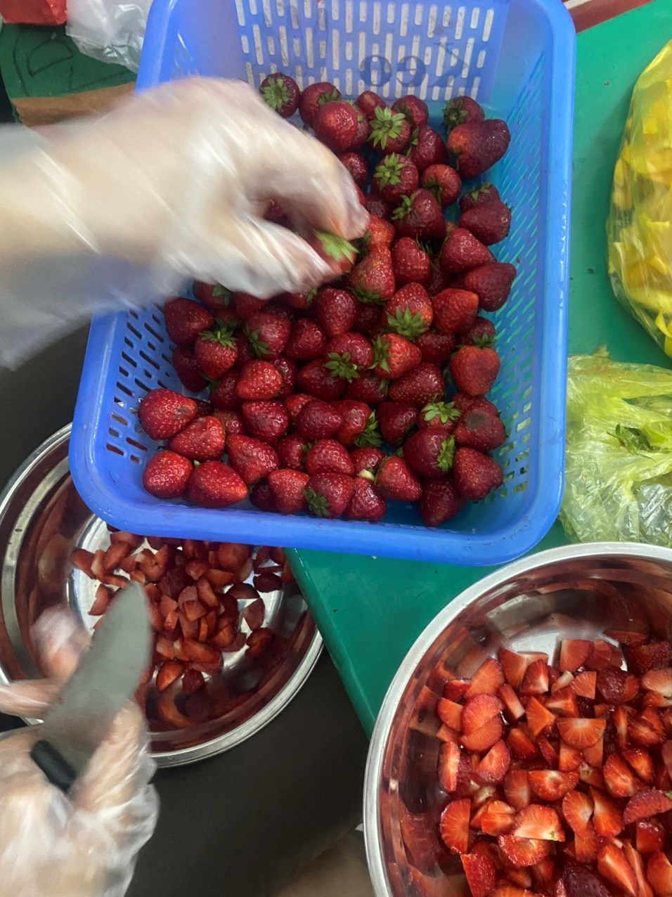 - Bước một (sơ chế phần nguyên liệu): Mít, dâu tây, dứa... sau khi rửa sạch và gọt vỏ, các cô cắt thành hình hạt lựu miếng vừa ăn.