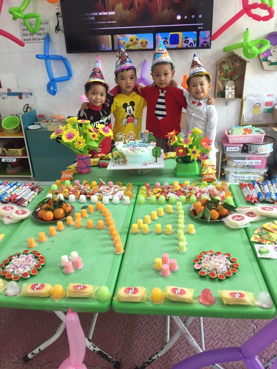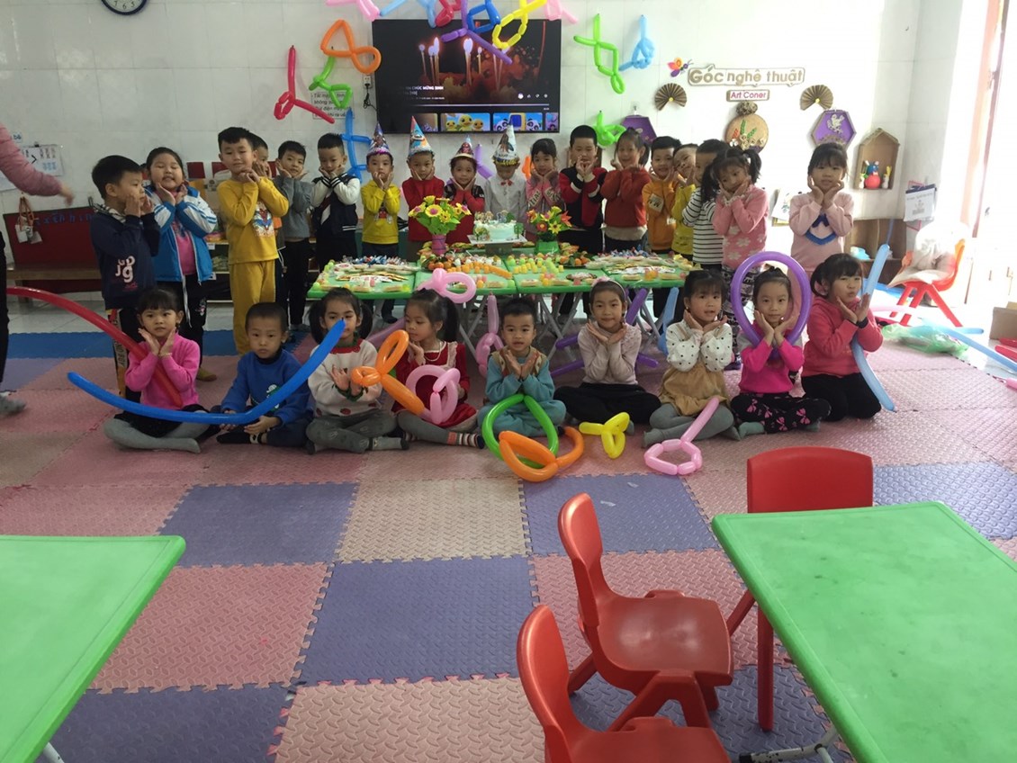 Hàng ngày khi đến trường các con không chỉ được vui chơi với bạn bè mà còn được các cô yêu thương chăm sóc, dạy dỗ. Các cô luôn tạo cho các con môi trường vui vẻ, thân thiện, tạo không khí và tâm lý vui vẻ cho các con khi đến lớp thông qua việc tổ chức các hoạt động trên lớp hàng ngày. Hoạt động tổ chức sinh nhật cho các con là một hoạt động rất ý nghĩa, giúp trẻ mạnh dạn, tự tin, thân thiện hơn khi giao tiếp hòa mình với các bạn trong buổi sinh nhật ngoài ra bữa tiệc sinh nhật tại lớp còn tạo cho trẻ sự vui vẻ phấn khích.