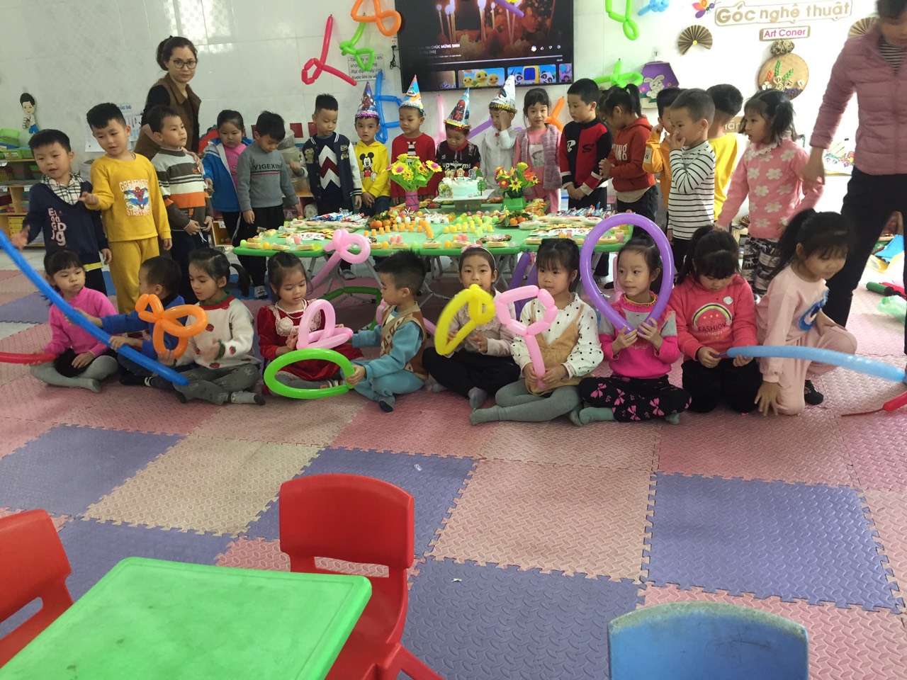 Hôm nay các lớp tổ chức sinh nhật cho các bé sinh tháng 12 ở tại lớp học. Đây là kỷ niệm thật đáng nhớ của bạn vì các bạn nhận được những lời chúc từ cô giáo và các bạn, chúc các bạn nhỏ thêm một tuổi luôn mạnh khỏe, ngoan ngoãn và hay ăn chóng lớn nha!