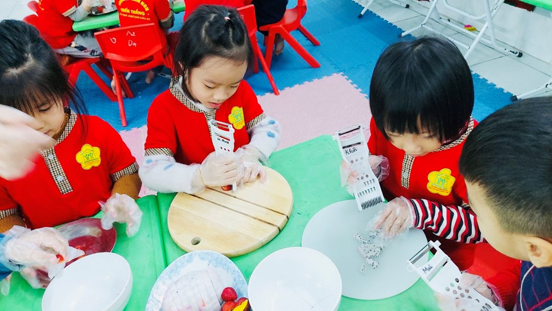 Cô Lê Thị Trang và các bé lớp A4 với giờ học "Làm món quả dầm".