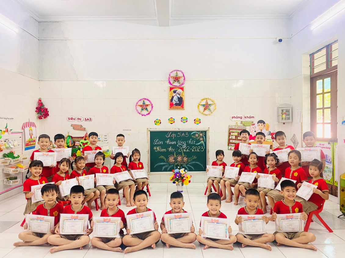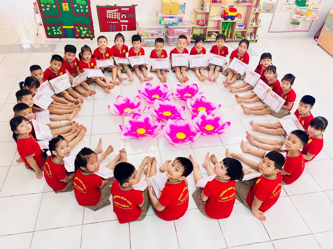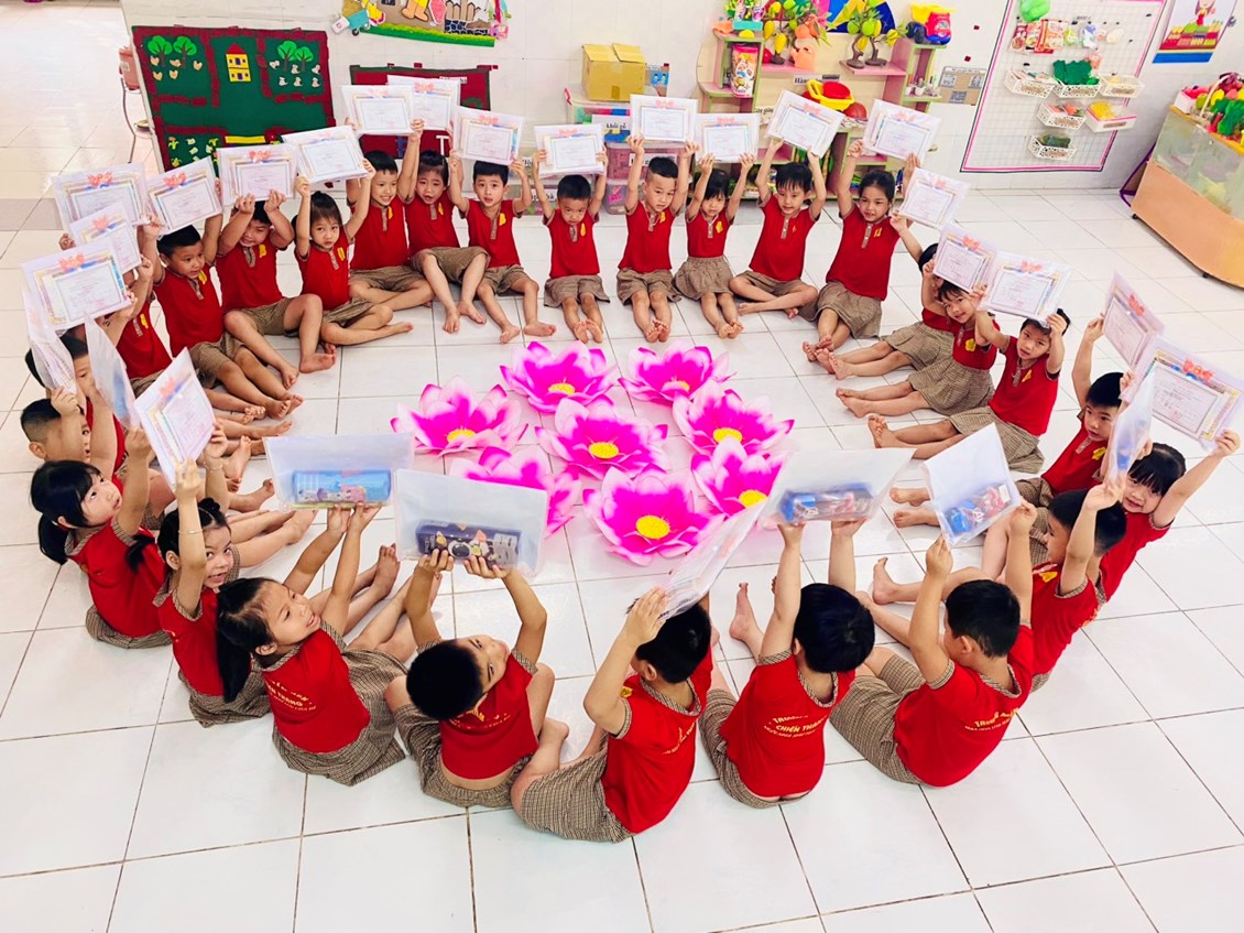 Những bức ảnh lưu niệm tại lớp với những món quà và chứng nhận thành tích học tập của các con dưới mái trường mầm non Chiến Thắng.
