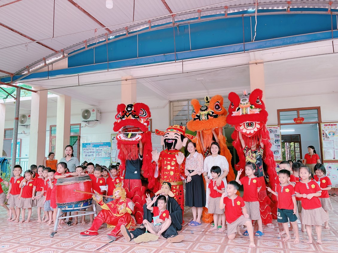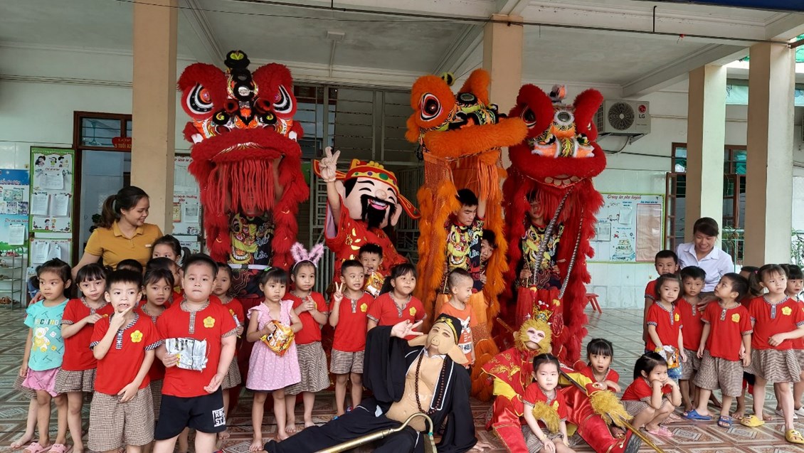 Trẻ được chụp ảnh lưu niệm tại lớp và vô cùng thích thú khi được chụp ảnh với đội lân.