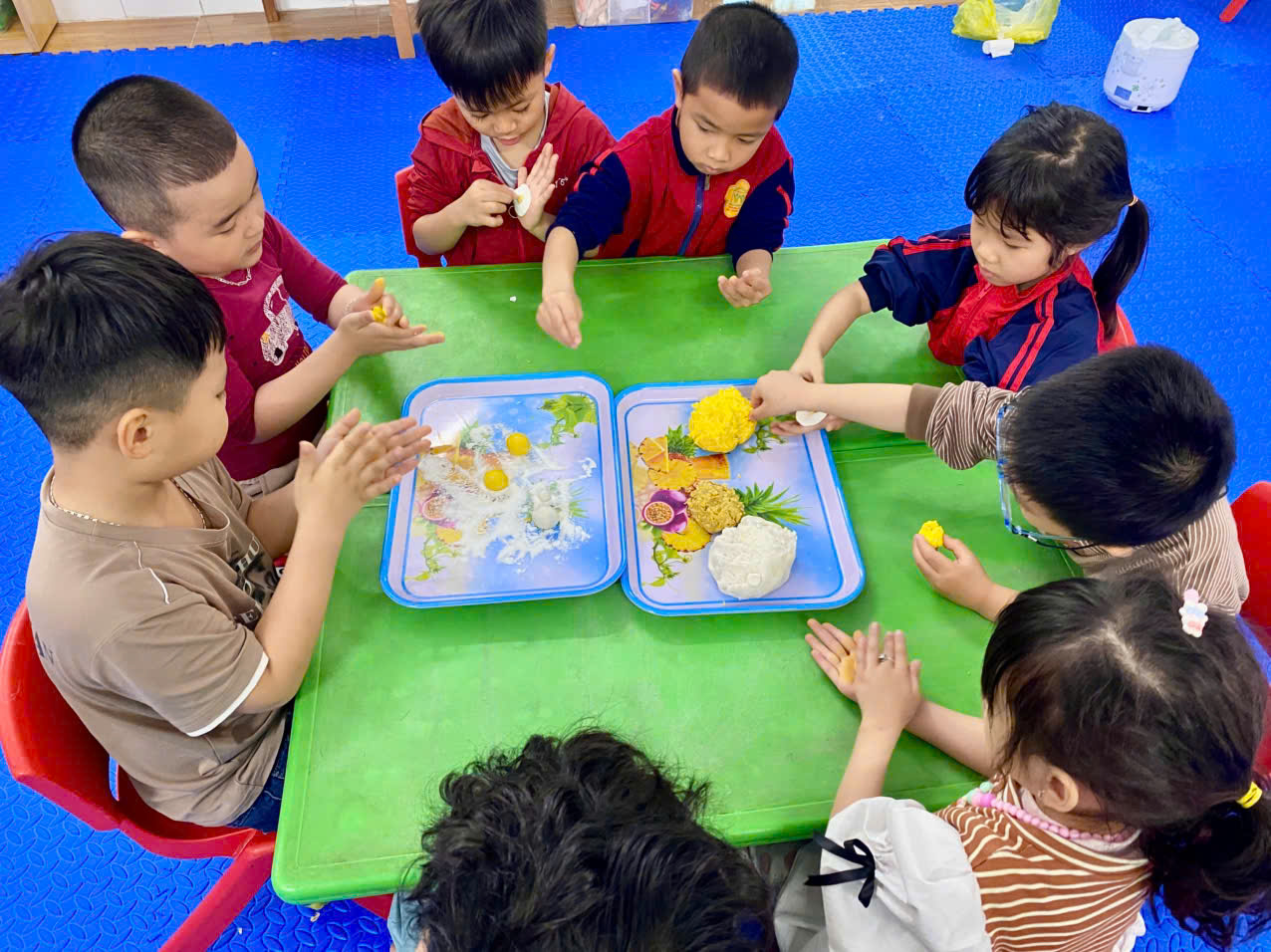 Những viên bánh tròn xinh xắn được nặn từ những đôi bàn tay đáng yêu của bé, được bé nâng niu và trân trọng biết bao vì đó chính là thành quả lao động miệt mài của các bé. Sản phẩm của các bé được các bác, các cô ở tổ nuôi luộc để chiều các con cùng nhau thưởng thức.