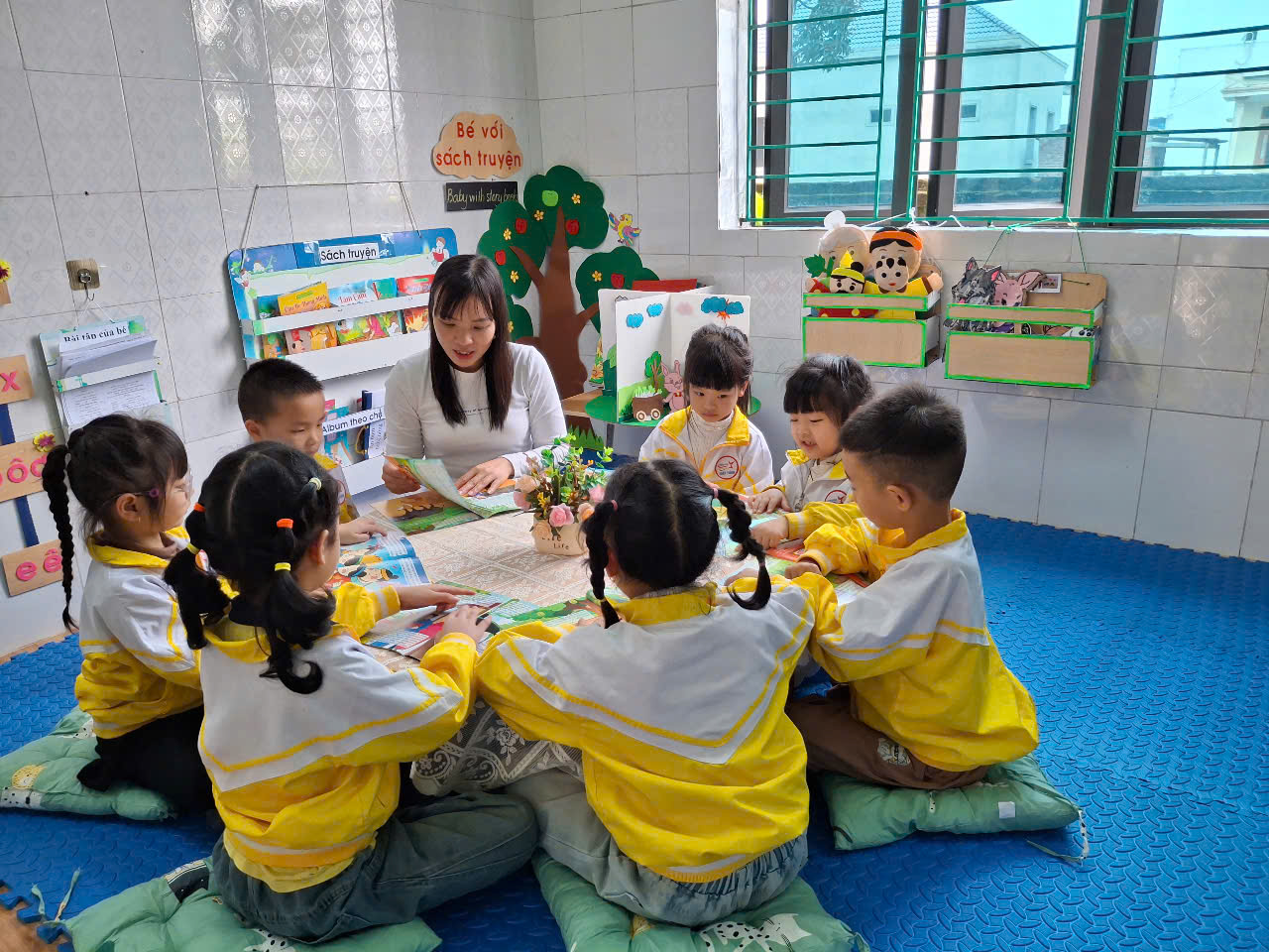 Khi được làm quen với góc thư viện, trẻ không chỉ hình thành thói quen yêu thích đọc sách mà còn phát triển ngôn ngữ, khả năng quan sát và tư duy tưởng tượng phong phú. Mỗi khi mở trang sách, các bé như bước vào một thế giới diệu kỳ, khi thì hồi hộp theo dõi câu chuyện, lúc lại vui vẻ, thích thú trước những hình ảnh sinh động, có khi còn xúc động và biết yêu thương hơn qua từng nhân vật. Ánh mắt say mê, nụ cười hồn nhiên hay những câu hỏi ngây thơ chính là minh chứng cho niềm vui và sự hứng khởi của trẻ khi đọc sách. Thông qua việc xem sách, kể lại câu chuyện, trẻ mạnh dạn hơn trong giao tiếp, biết lắng nghe và chia sẻ với bạn bè. Ngoài ra, góc thư viện còn góp phần rèn luyện tính tự giác, ý thức giữ gìn sách và hình thành nếp sống ngăn nắp cho trẻ. Đây thực sự là môi trường học tập tích cực, giúp trẻ phát triển toàn diện cả về trí tuệ lẫn cảm xúc.